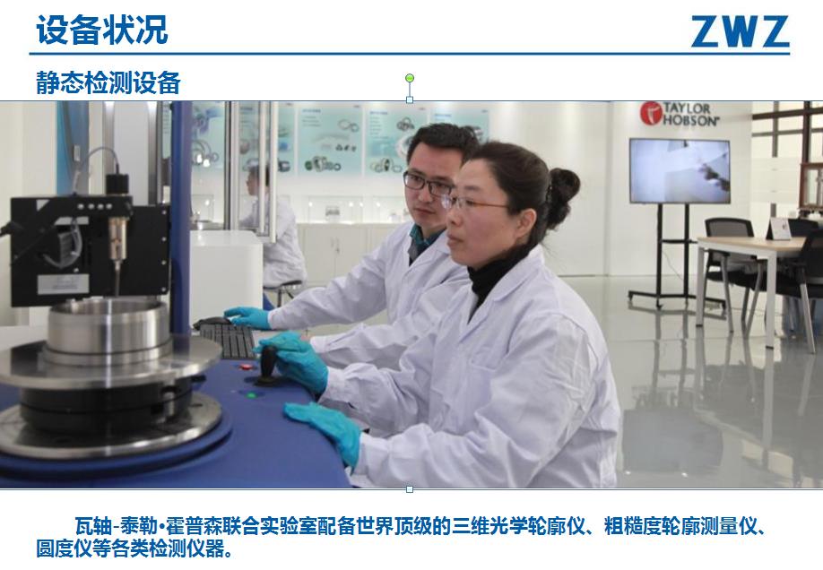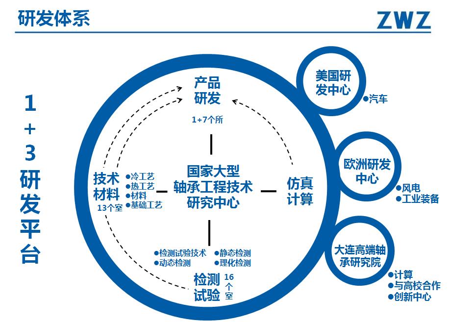 工程技术中心集轴承设计开发、工艺研究、检测试验、计算分析、轴承专用装备研发为一体,具有较强的技术转化和技术创新能力。工程技术中心共有172人,其中:教授级研究员级高级工程师10人、高级工程师42人。工程技术中心整体形成“1+3研发平台”体系,以国家大型轴承工程技术研究中心为核心,由美国研发中心、欧洲研发中心和大连高端轴承研究院共同组成,工程技术中心以产品研发为纵轴,工艺研发、检测试验研发及计算分析为横轴,建立矩阵式技术创新研发体系。美国工程技术中心轴承检测和计量设备配置到位,具备了产品设计、仿真计算、寿命试验、失效分析和客户工程服务等能力;欧洲研发中心依托KRW公司,重点开展风电轴承、工业装备类轴承的应用技术研发,为公司技术创新能力的提升提供支持。整个平台的研发、试验设备设施等硬件条件均达到国际先进水平。工程技术中心拥有各类轴承检测、试验设备、仪器200余台套,其中:轴承动态寿命与性能试验设备80余台,材料检验设备40余台,轴承精度检验设备80余台;大型风电轴承检验设备可以试验最大外径3.6米的风电转盘轴承、主轴轴承可试验最大外径1.2米。工程技术中心的检测试验中心出具的检测报告可与国际16个国家23个组织机构互为承认检测结果。2016年,瓦轴同英国泰勒公司合作成立“瓦轴-泰勒联合实验室”,应用泰勒公司最先进的轴承检测技术,解决国内轴承检测的难题,提升瓦轴检测水平。2017年,瓦轴同英国ROMAS合作建立“瓦轴集团ROMAX全球轴承联合仿真技术中心”;通过Romax全球最优秀的轴承专家团队资源,应用最前沿的轴承仿真技术,开展轴承设计分析、故障诊断等工作,瓦轴的计算分析能力国内一流 。