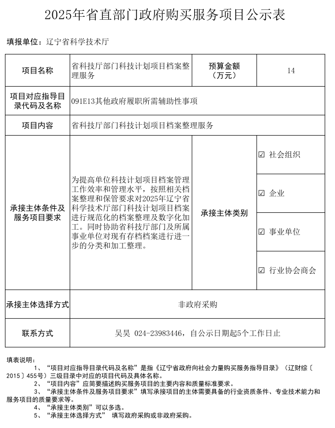 2025年省直部门政府购买服务项目公示表(奈飞 部门科技计划项目档案整理服务)